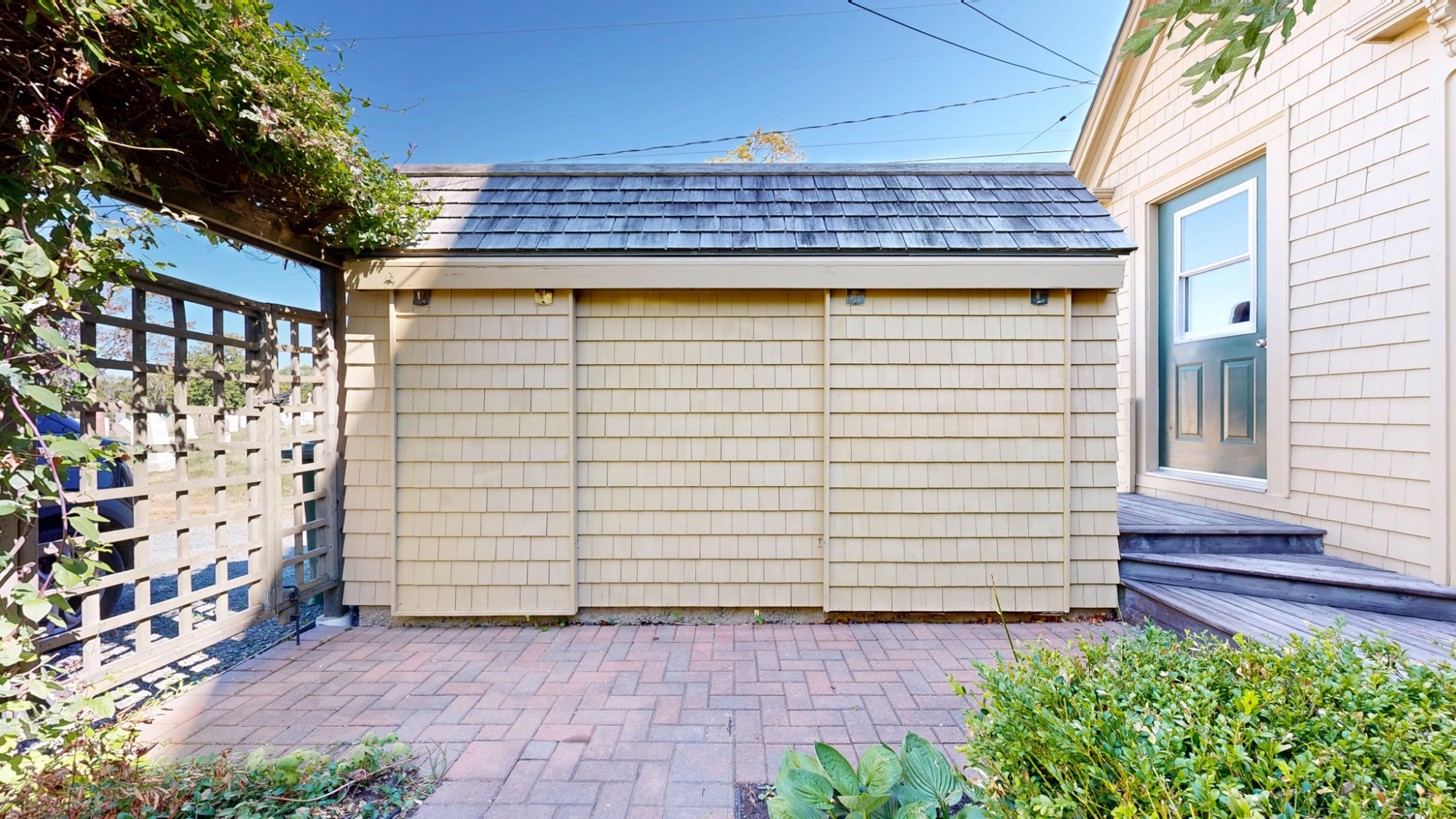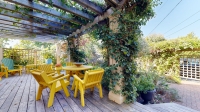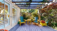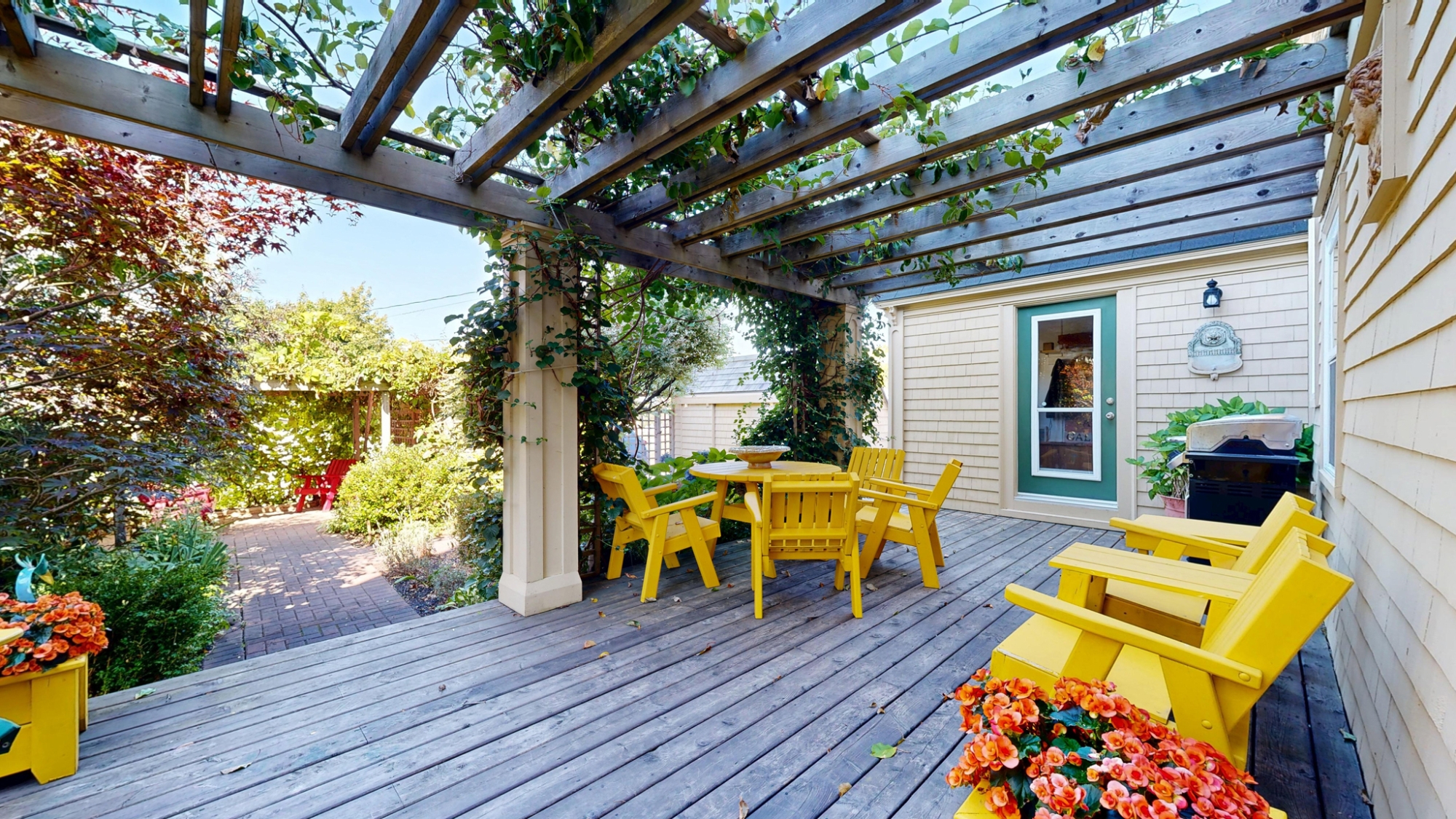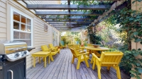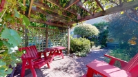 The home's beautiful and stylish living space extends to the outside where, at the back of the house, a house-wide pergola covered deck, gardens with walkways, and grape vine shaded patio area create a completely hidden oasis.