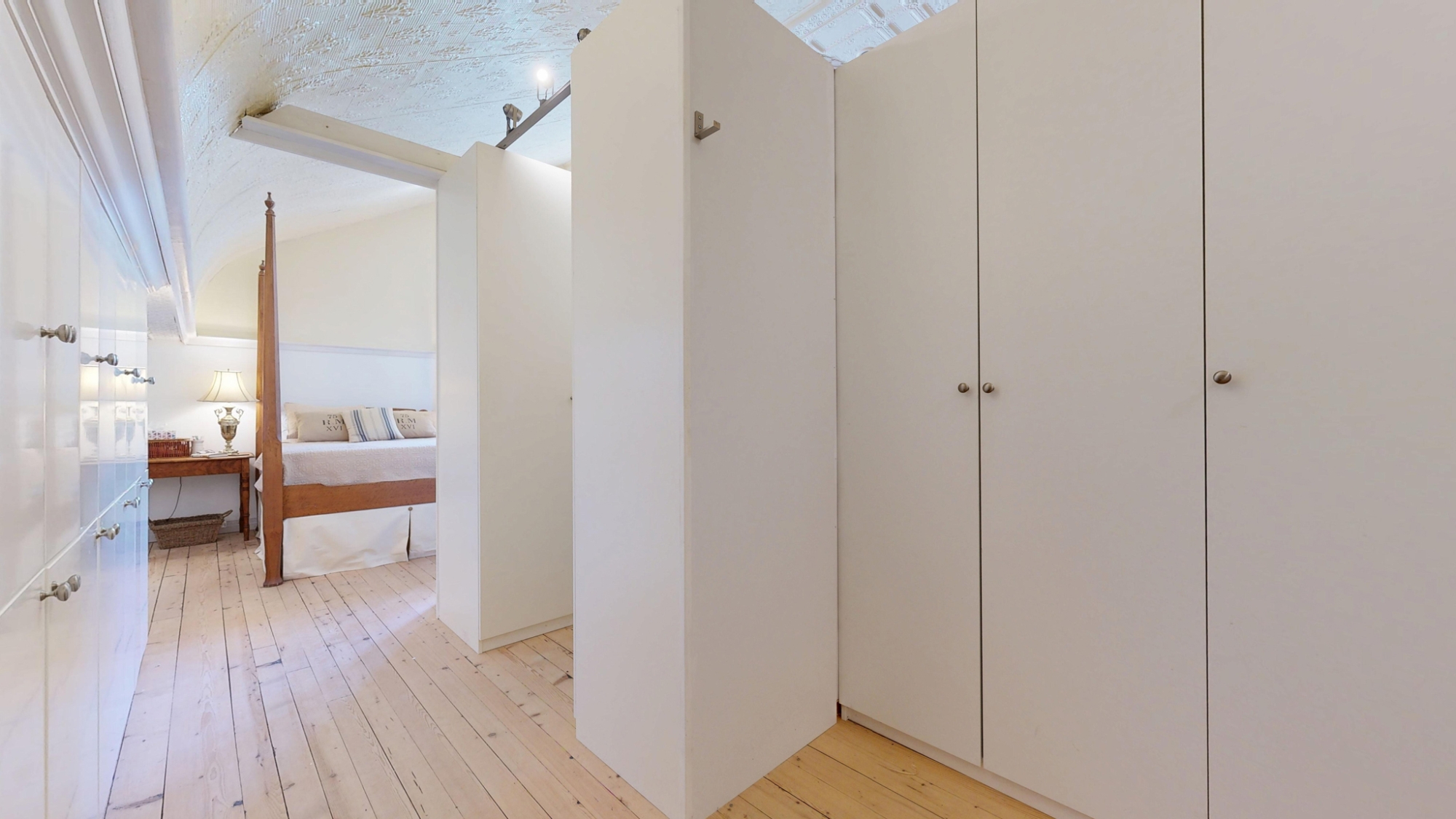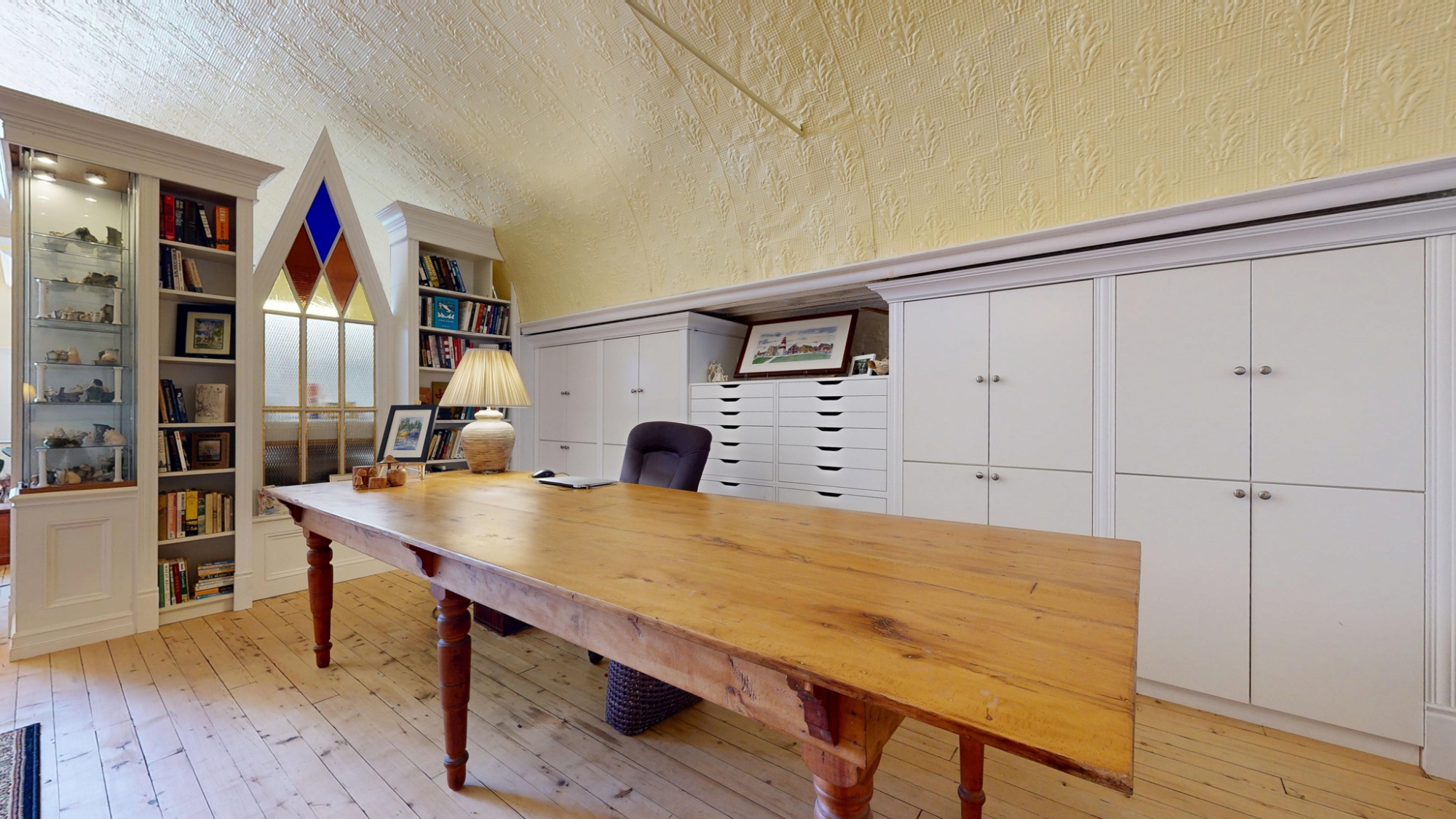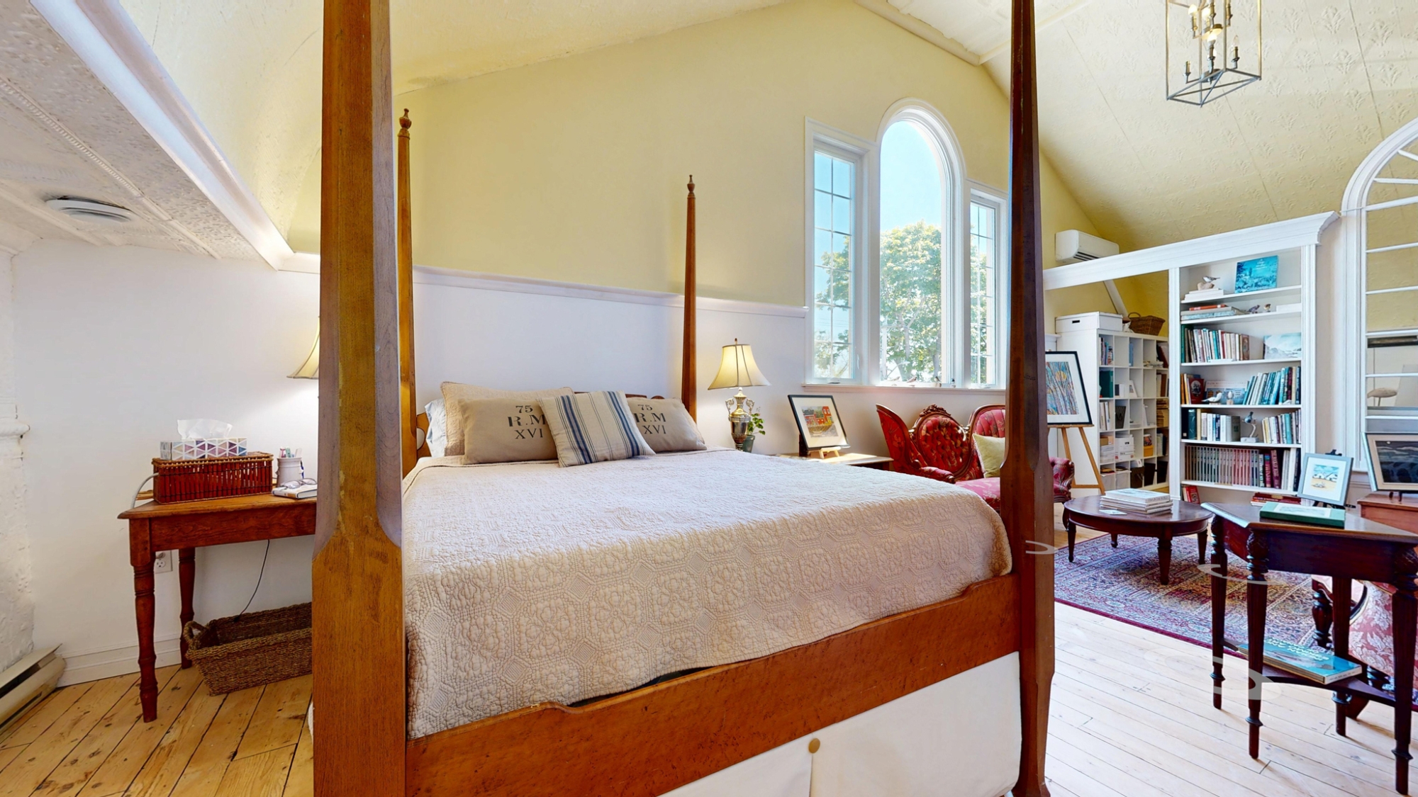 The entire second floor is one breathtaking space set under the original vaulted tin ceiling that soars nearly 15’ overhead. This magnificent and voluminous room houses a luxurious Primary Bedroom Suite with large dressing room/walk-in closet, a spacious 4-piece ensuite, an expansive library, a sprawling den and office, powder room, and artist’s studio – all under the same awe-inspiring ceiling, yet each space cleverly delineated by beautiful cabinetry partitions that incorporate some of the original windows.