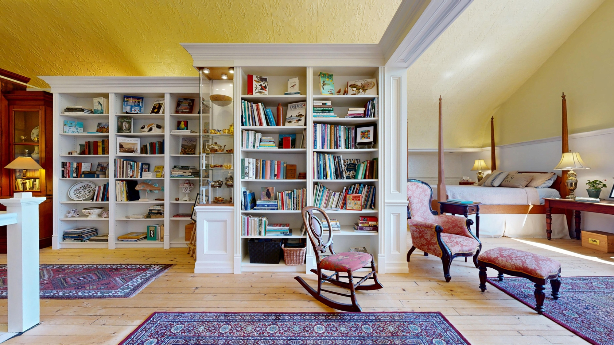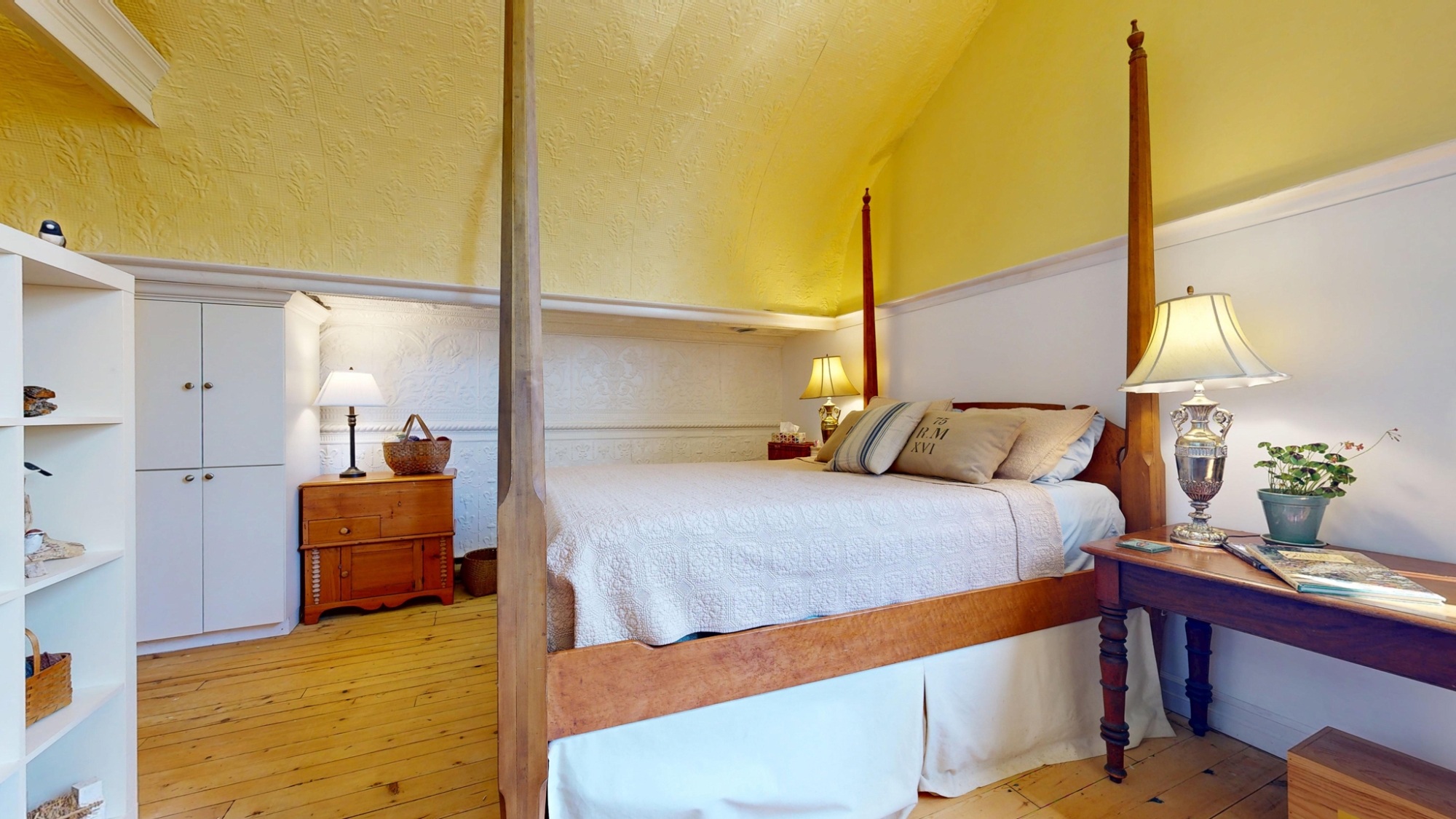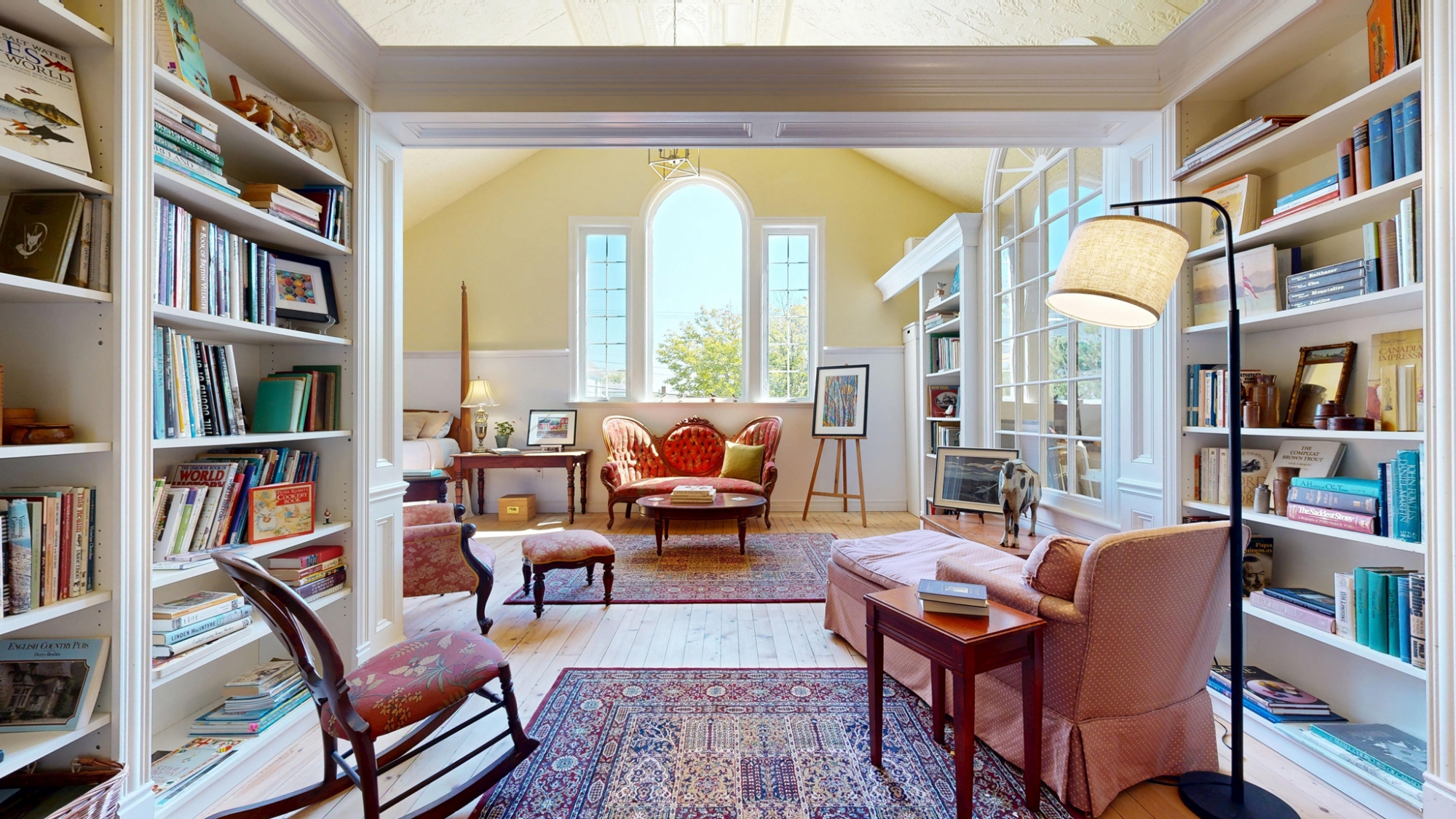 The entire second floor is one breathtaking space set under the original vaulted tin ceiling that soars nearly 15’ overhead. This magnificent and voluminous room houses a luxurious Primary Bedroom Suite with large dressing room/walk-in closet, a spacious 4-piece ensuite, an expansive library, a sprawling den and office, powder room, and artist’s studio – all under the same awe-inspiring ceiling, yet each space cleverly delineated by beautiful cabinetry partitions that incorporate some of the original windows.